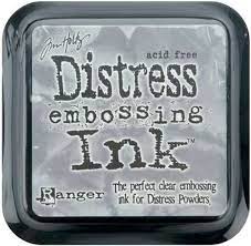 - Tim Holtz Distress Embossing Ink contains a specially formulated clear ink that works with Distress Embossing Glaze and other Embossing Powders. The ink stays wet on most surfaces to allow time to use with stamps, stencils, or to create your own designs.
